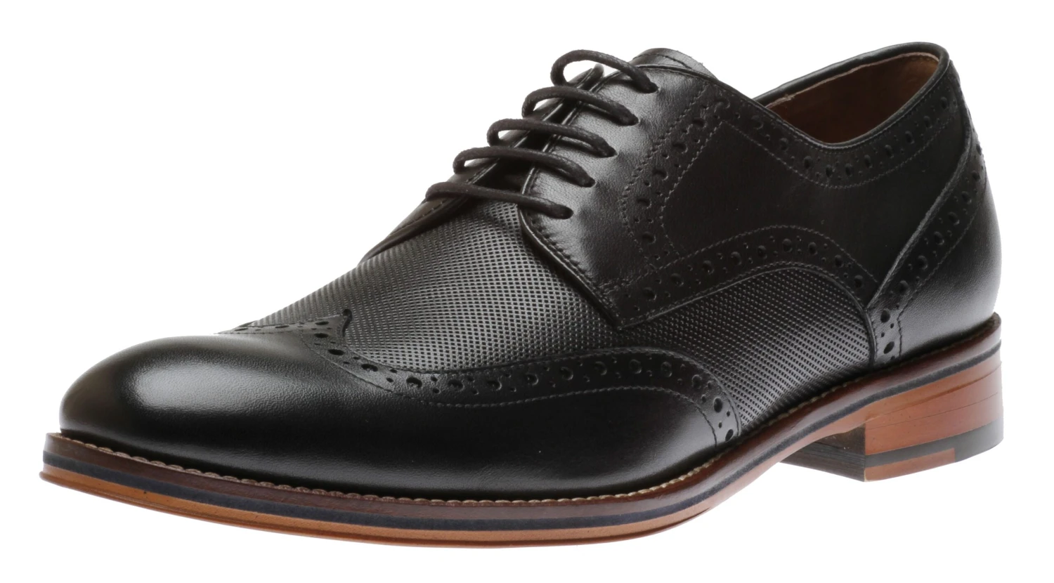 The Conard derby shoe is a classic dress shoe that features an Italian calfskin leather upper in an embossed wingtip silhouette. Designed with a leather welt for enhanced durability and support, it also features adjustable laces for a secure fit. Inside, a smooth leather lining keeps feet breathing easily while a fully padded cushioned insole imparts underfoot comfort and support. A durable rubber outsole delivers flexible shock-absorbing traction.