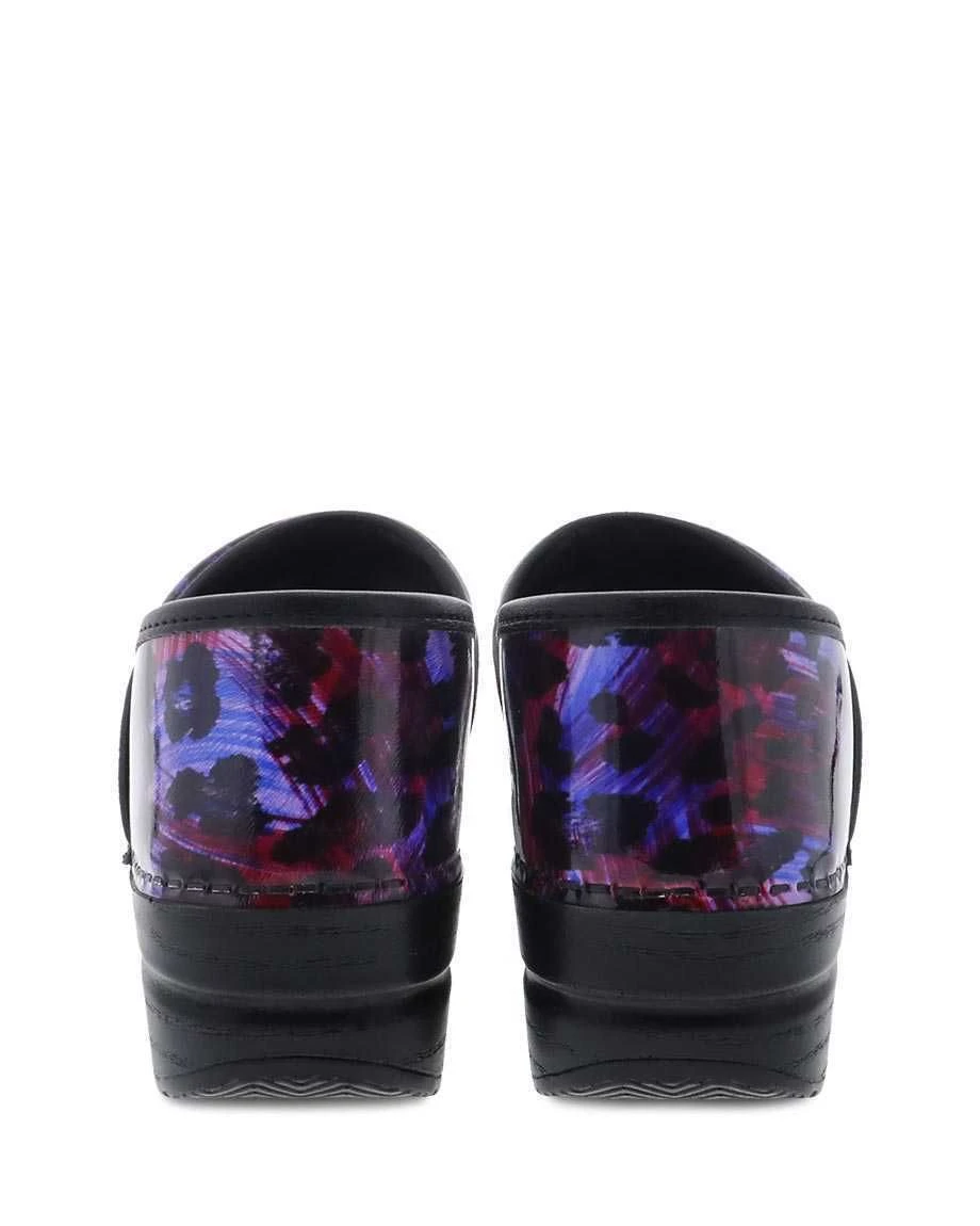 The Dansko Painted Leopard professional clog will brighten up your work day. The Dansko Professional is the Dansko flagship clog. The patent leather clog features a fresh, purple painted leopard patterned upper that will add a pop of color to your scrubs, uniform or even your casual t-shirt and jeans. Inside its iconic silhouette is a roomy reinforced toe box, an anatomically contoured PU midsole, an inner frame for stability and support, a padded instep collar, and a protective heel counter that allows the heel to move up and down freely while providing lateral stability. The anti-fatigue rocker bottom assists with forward motion while walking to add hours of comfortable support throughout your day. Wear this leather slip on professional work clog with anything in your closet, from slacks to scrubs and everything in between.
