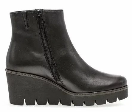 The Gabor 54.780.27 wedge ankle boot is a showstopping statement that features a beautifully crafted upper in black leather with a side zipper fastening and a rubber grip sole, creating a look that feels modern and chic and offers the utmost in walkable comfort.