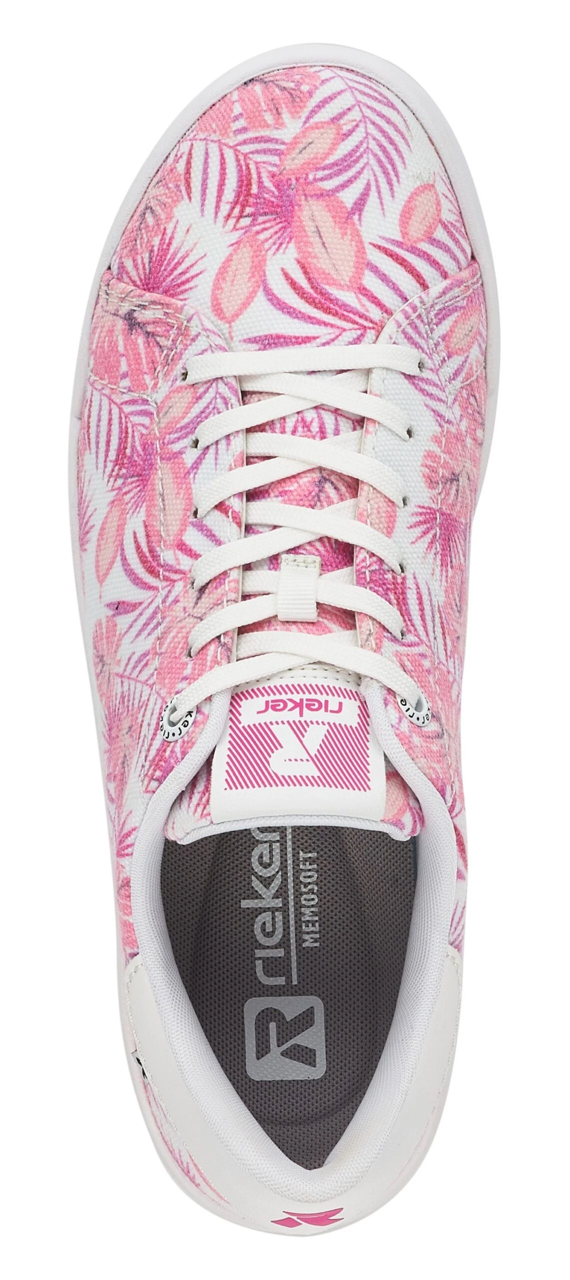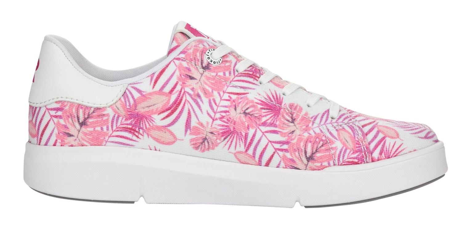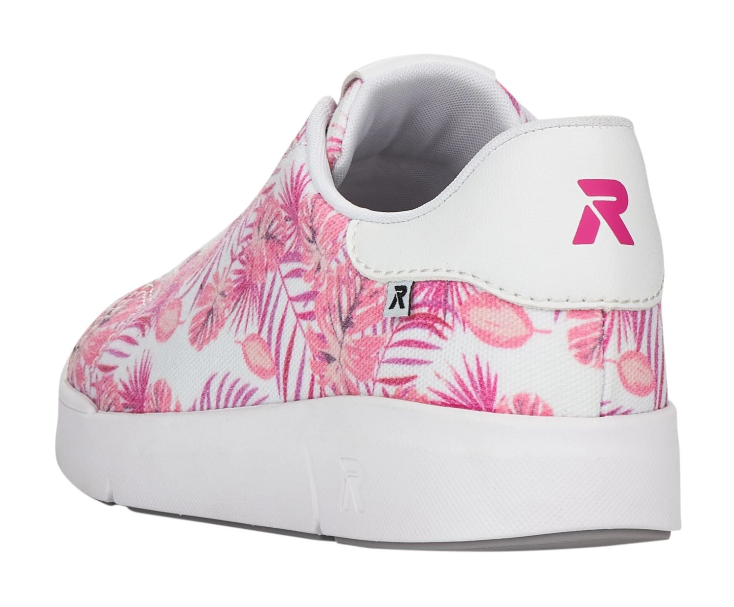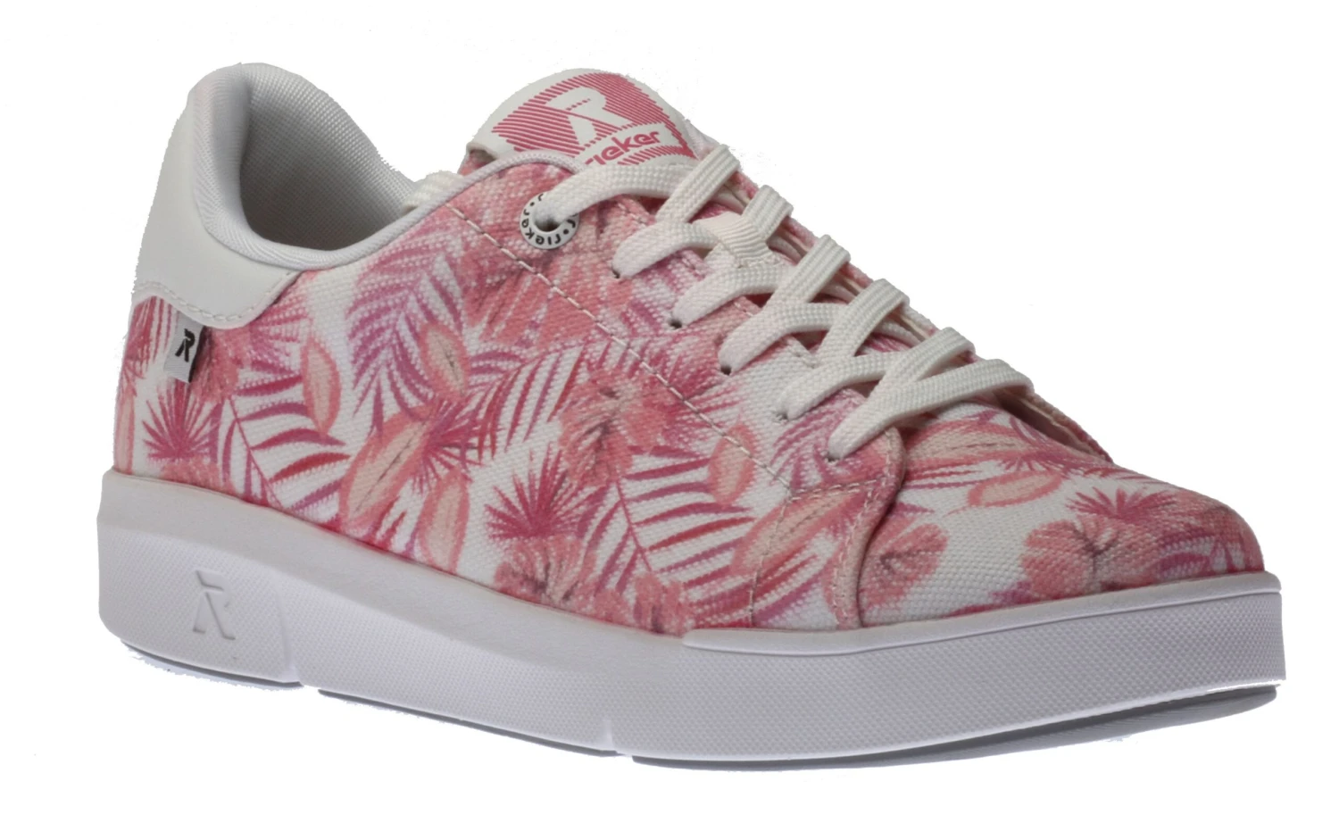 These Leinen sneakers by R-Evolution from Rieker will be your go-to sneakers this spring and summer or a winter getaway south! These sneakers feature a white textile upper with a tropical pink palm leaf print for a breezy, stylish look. Adjustable laces ensure a secure and comfortable fit. Inside, a memory soft insole provides shock-absorbing comfort and support. A durable, lightweight, flexible rubber outsole provides stable shock-absorbing traction.