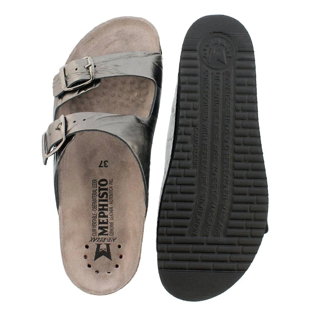 Add a touch of glamour to your summer wardrobe with the Harmony slide sandals by Mephisto! Ultra-comfortable with its anatomic correct footbed, cork midsole and multi-layered footbed integrated with Soft-Air Technology to reduce shock, it’s hard for any other sandal to compete. The upper is made of a leather upper with a beautiful crinkle effect. Adjustable instep straps ensures a secure fit and an EVA outsole absorbs shock and reduces stress put on your feet, legs and back. Try these Mephisto sandals and never look back!