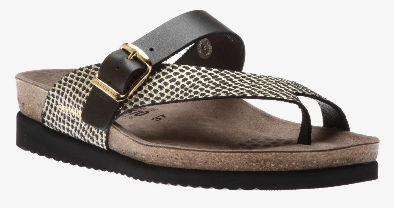 Add a touch of glamour to your summer wardrobe with these beautiful, textured Helen Mix Black Cuba thong sandals by Mephisto! Ultra-comfortable with its anatomic correct footbed, cork midsole and multi-layered footbed integrated with Soft-Air Technology to reduce shock, it’s hard for any other sandal to compete. An adjustable instep strap ensures a secure fit, a thin toe post helps eliminate irritation and an EVA outsole absorbs shock and reduces stress put on your feet, legs and back. Try these Mephisto sandals and never look back!