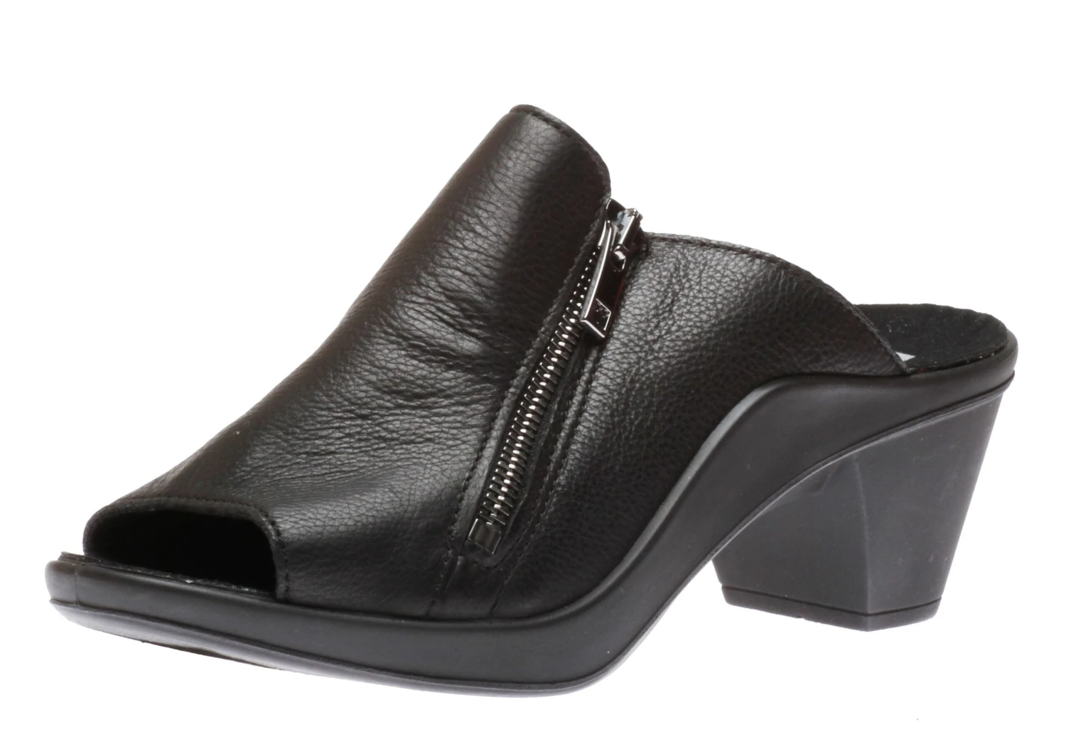The Mokassetta 297 is a bold but versatile slide heeled sandal. This sandal transitions easily from day to night. The Mokassetta 297 sandal features a black leather upper and a functional and bold silver zipper embellishment on the side. Pair the Mokassetta 297 sandal with black jeans and a chic blouse for an easy, stylish outfit!