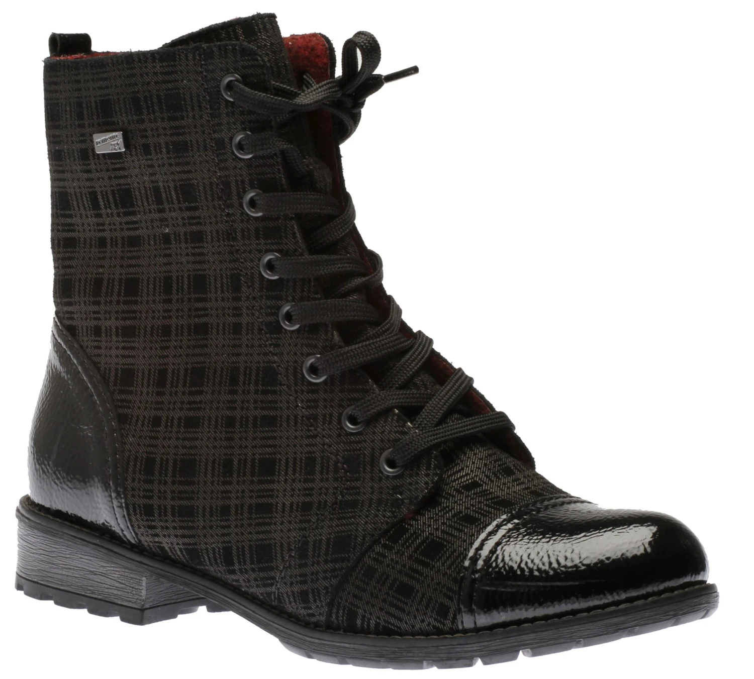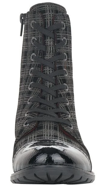 The Softlack is an elegant ankle boot with beautiful details like a black patent heel and toe cap and a tartan plaid pattern on the upper. An inside zipper provides an easy on and off and the lace-up closure provides a customizable fit. The boot also features a warm velvet lining enhanced with TEX, a water repellant, moisture-wicking membrane to keep feet in dry comfort. This boot will fit well with your work and casual wardrobe.Â