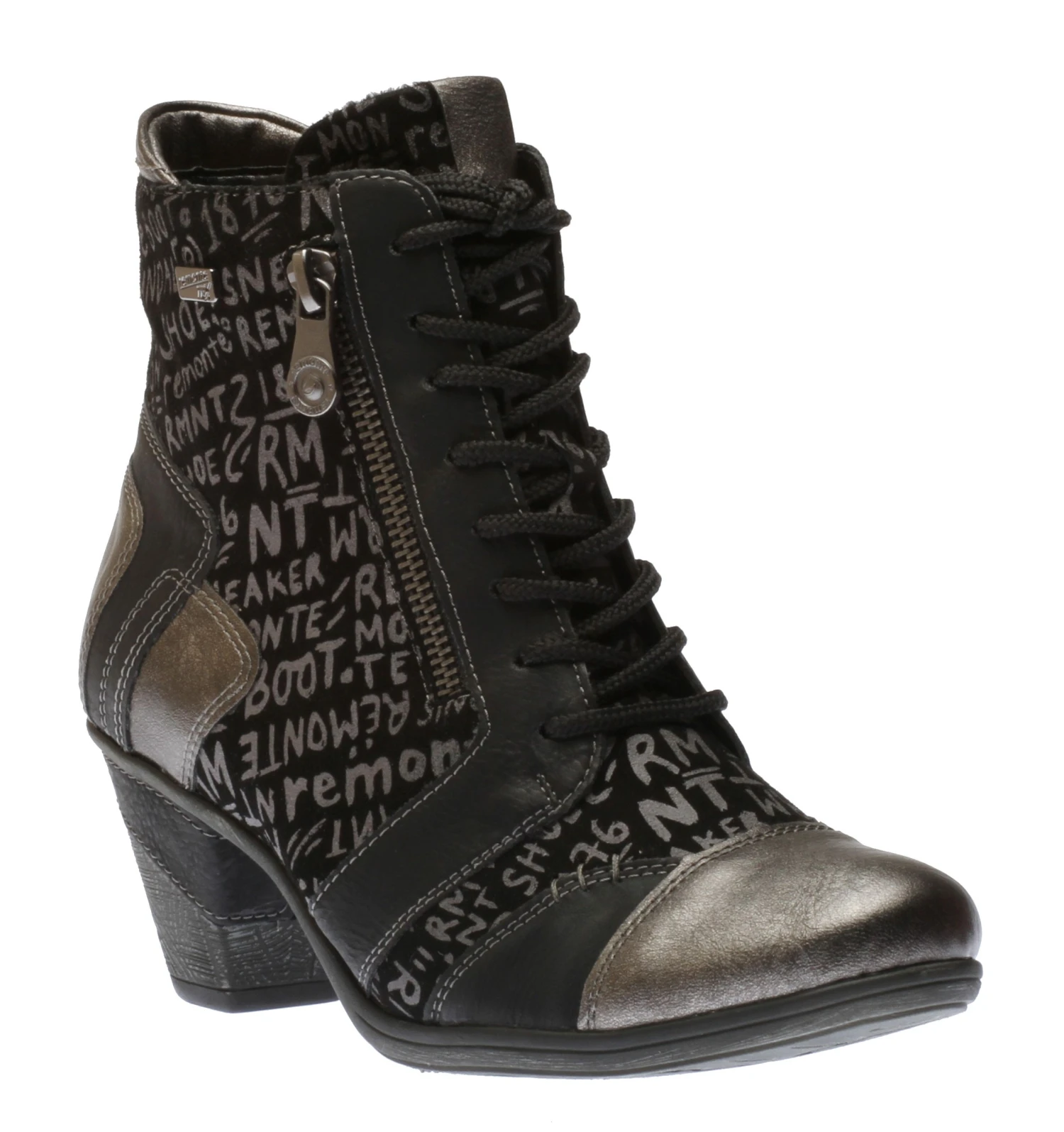 These stunning Posen ankle boots comprise of contrasting textures, contrast stitching and a fun letter print for a fun, unique vintage look. This ankle bootie features a suede leather upper with printed letters, a patchwork of pewter and black leather panels and a cap toe. Adjustable laces and a side zipper ensure a secure fit and an easy on and off. Inside, the boot also features a warm velvet lining enhanced with TEX, a water repellant, moisture-wicking membrane to keep feet in dry comfort, while a removable insole helps reduce fatigue and deliver all-day cushioning and support. A partially leather-wrapped chunky heel and a durable, flexible, lightweight, thermoplastic rubber outsole provides stable shock-absorbing traction.Â