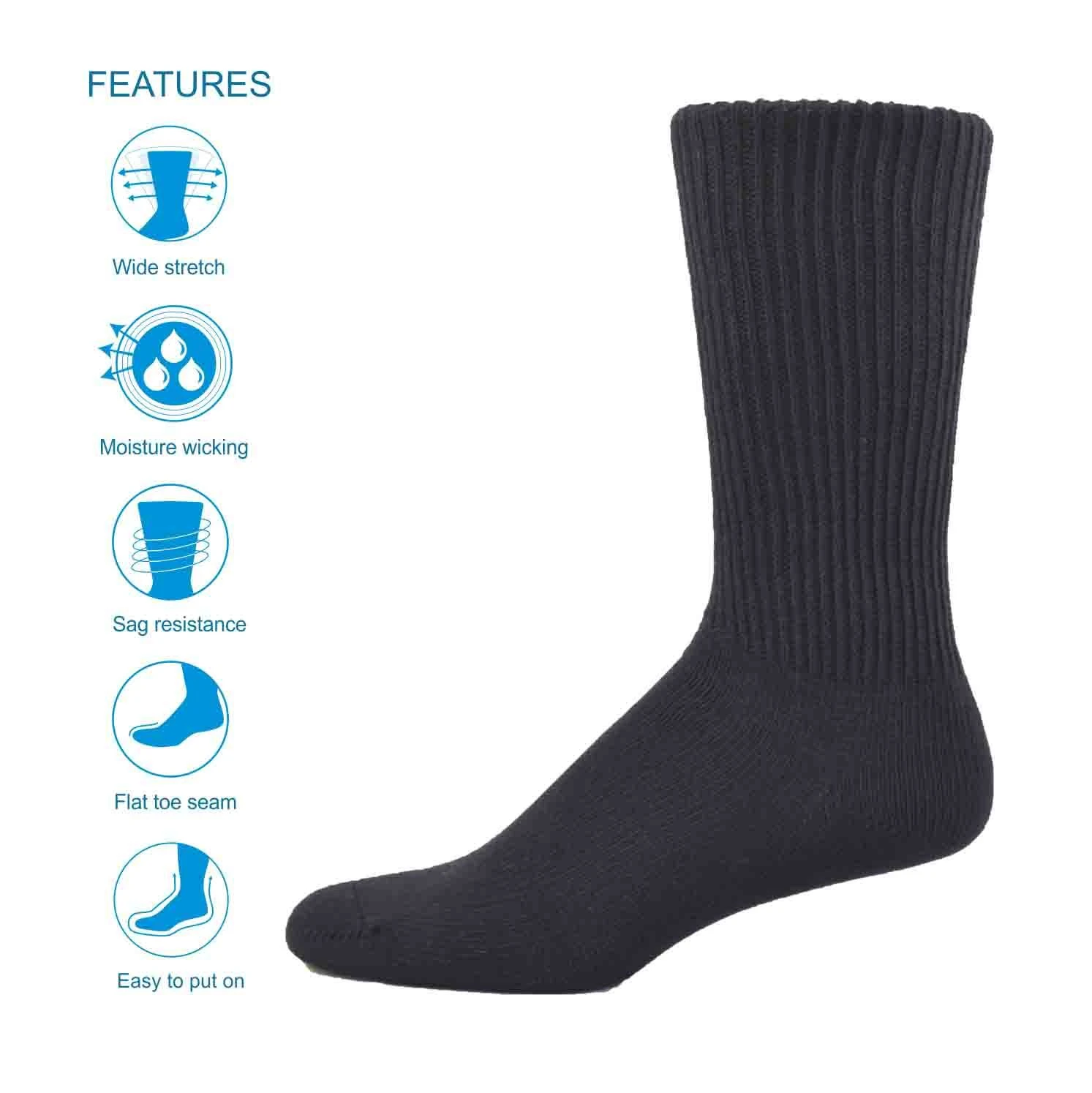 - Wide cross stretch:Â Knit with high stretch memory retentive fibres that allow the sock to gently mold to almost any size leg without pinching or binding