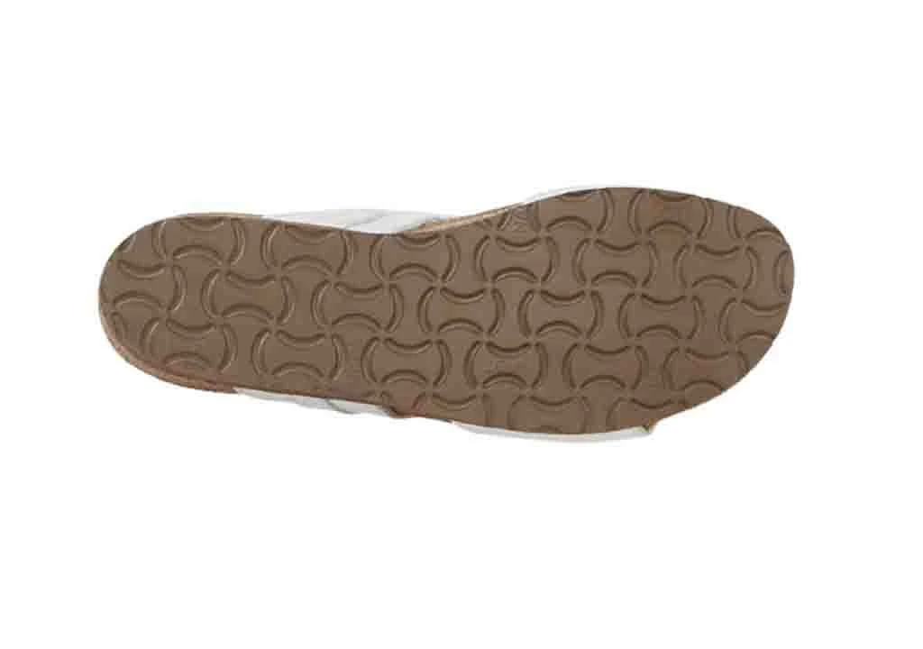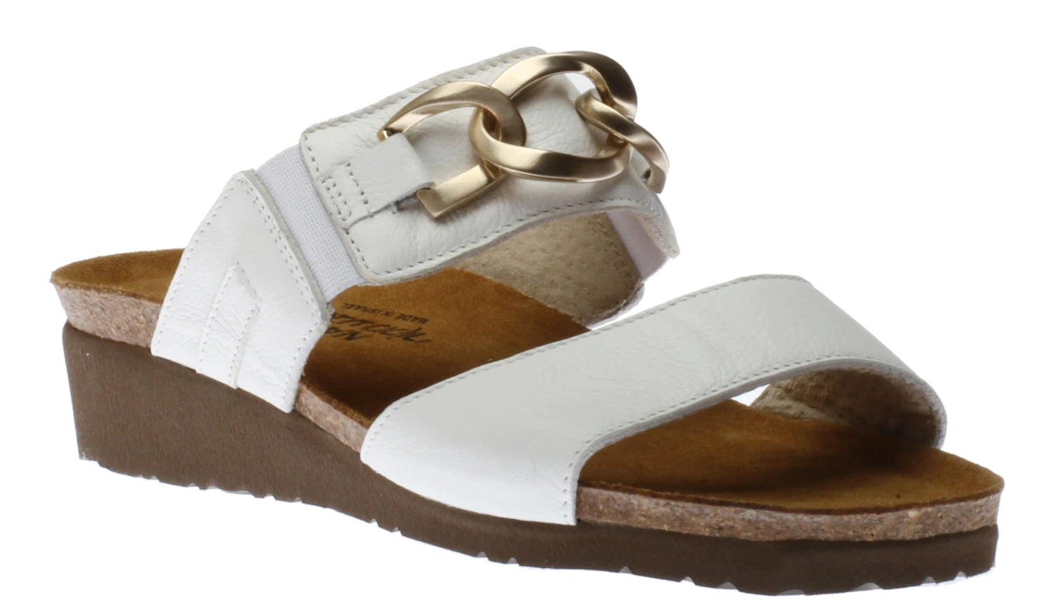 The Victoria is a bold but versatile slide wedge sandal. This sandal transitions easily from day to night. The Victoria sandal features a neutral white leather upper and a bold gold chain embellishment. The sandal also features elastic goring at the instep for a secure fit. Naot’s anatomic cork and latex footbed is wrapped in a pampering suede and molds to the shape of the foot with wear. Pair the Victoria Sandal with black jeans and a chic blouse for an easy, stylish vacation outfit!